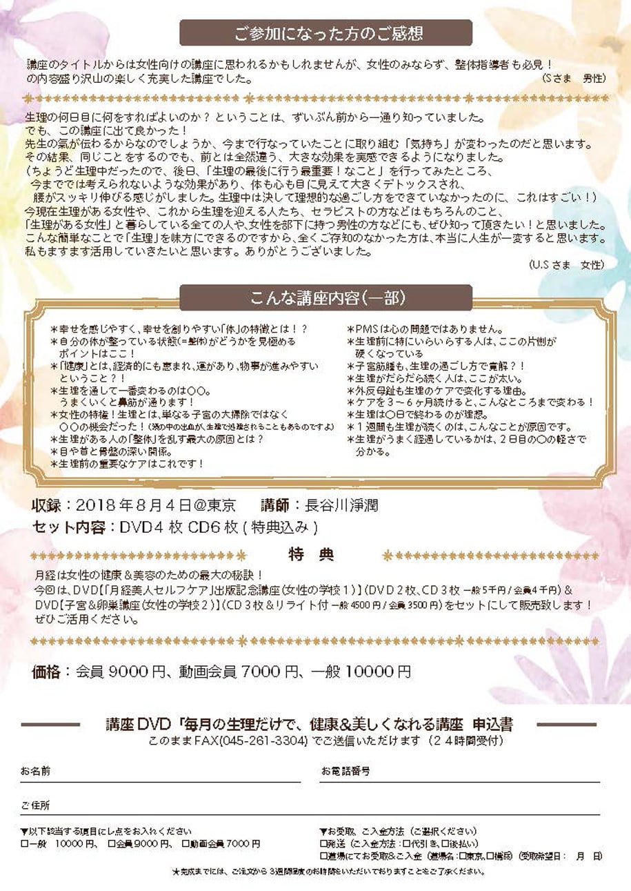 ★今回は、「毎月の生理だけで 健康&美しくなれる講座」(DVD1枚、2018年8月4日収録)に加え、以下の【特典】をセットにして販売いたします。ぜひご活用下さい。